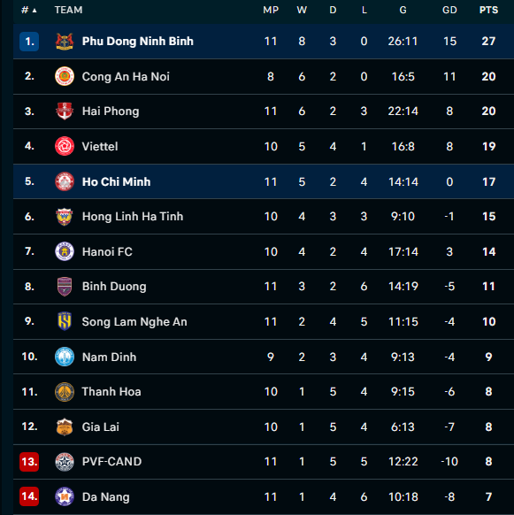 Nhờ sự tỏa sáng của Hoàng Đức, Ninh Bình đã thắng 4-3 Công an TP HCM, qua đó củng cố vững chắc ngôi đầu bảng V-League sau vòng 11. |