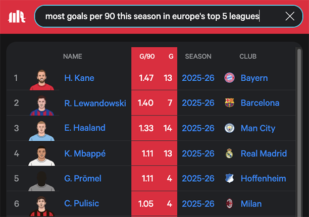 Theo thống kê, Robert Lewandowski là cầu thủ có hiệu suất ghi bàn tốt thứ 2 tại 5 giải VĐQG hàng đầu châu Âu mùa này, chỉ xếp sau Harry Kane. |