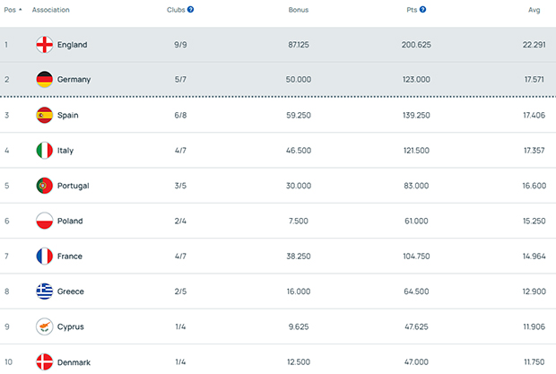 Với sự vươn lên mạnh mẽ, Tây Ban Nha có thể sẽ qua mặt Đức trong cuộc đua giành suất thứ 5 tham dự đấu trường Champions League mùa tới. |