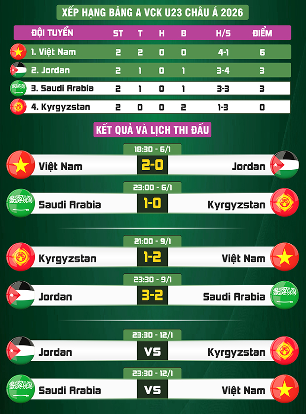 Do U23 Jordan đánh bại U23 Saudi Arabia ở lượt trận thứ 2 nên U23 Việt Nam chưa thể đoạt vé vào tứ kết giải U23 châu Á 2026 dù thắng cả 2 lượt trận. |